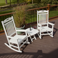 Trex Furniture: Is Outdoor inspired. Carefree attitude required. Change up the everyday and discover how comfortable outdoors can be.There’s really only one way to enjoy the freedom of being outdoors—relaxing in the outstanding comfort and unmatched style of Trex® Outdoor Furniture™. It just doesn’t get any better. Creating an outdoor living, dining and entertaining space with Trex Outdoor Furniture gives you the freedom to escape all things structured. Break away from routines and take those ordinary, everyday activities outside. Suddenly, you and your family will find yourselves enjoying the unrestricted boundaries of a whole new comfort zone. Trex Outdoor Furniture adds more than just comfort and beauty to your Trex® deck. This eco-friendly furniture is constructed of solid POLYWOOD® recycled lumber. That means you can count on it to last through the years with very little maintenance required to keep it looking like new. All-Weather Resistance Trex Outdoor Furniture™ is made with a high-density polyethylene (HDPE). Because HDPE products are made with a single, purified polymer, they are manufactured to exacting, reproducible specifications. They have exceptional resistance to corrosive substances, oil and fuels, insects, fungi, salt spray, and other environmental stresses. They do not absorb moisture; therefore, they will not rot, splinter, or crack. HDPE products have excellent weathering resistance; however, as with other polyolefins, it is possible that the material will fade slightly over the service life of the product. These products require no waterproofing, painting, staining, or similar maintenance when used in many exterior applications.
